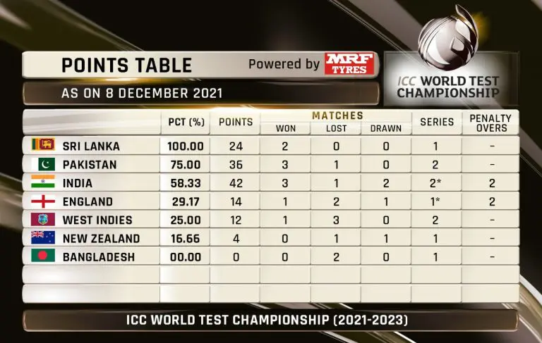 ٹیسٹ چیمپئن شپ کے پوائنٹس ٹیبل پر سری لنکا کی پہلی اور بھارت کی تیسری پوزیشن ہے جب کہ انگلینڈ چوتھے، ویسٹ انڈیز پانچویں، نیوزی لینڈ چھٹے اور بنگلہ دیش ساتویں نمبر پر موجود ہے۔